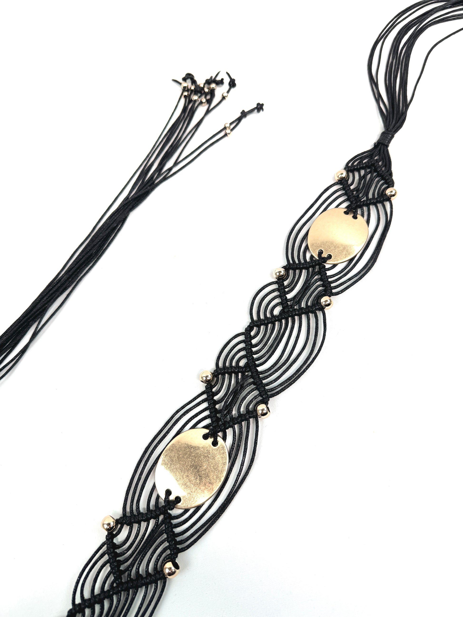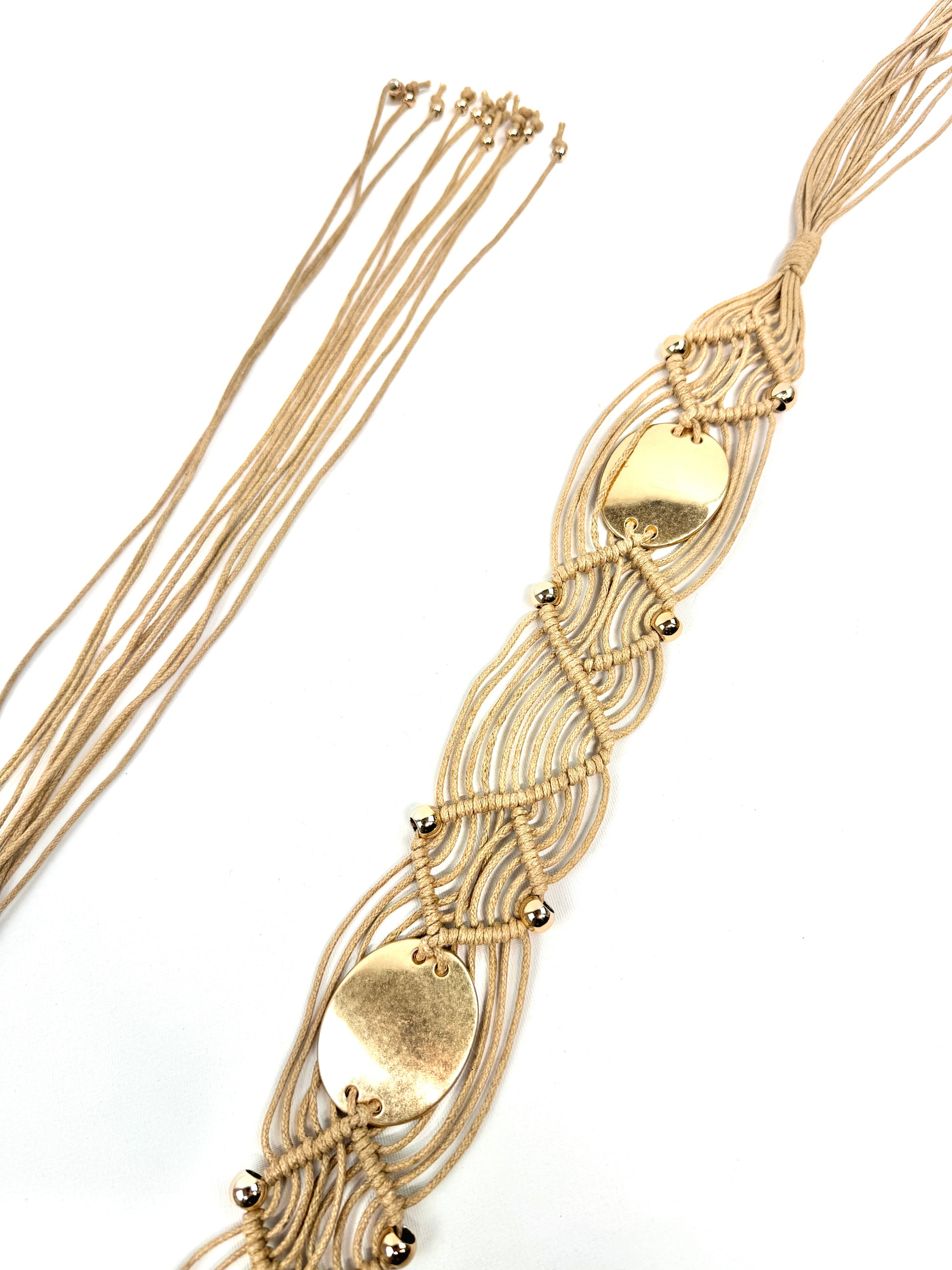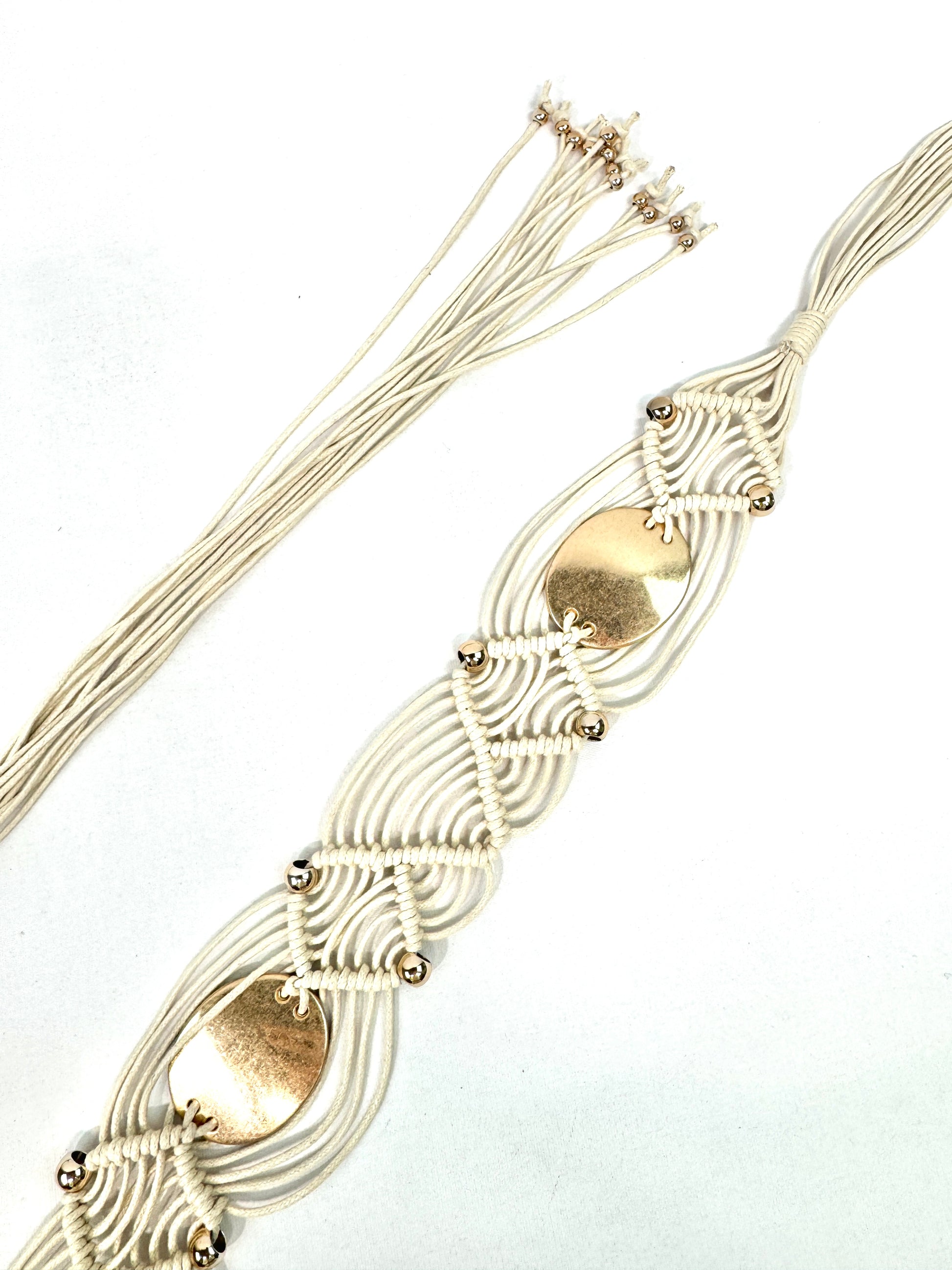 CEINTURE SYNTHÉTIQUE MACRAMÉ "Aura Solaire" TISSAGE SABLE & PASTILLES DORÉES 910288