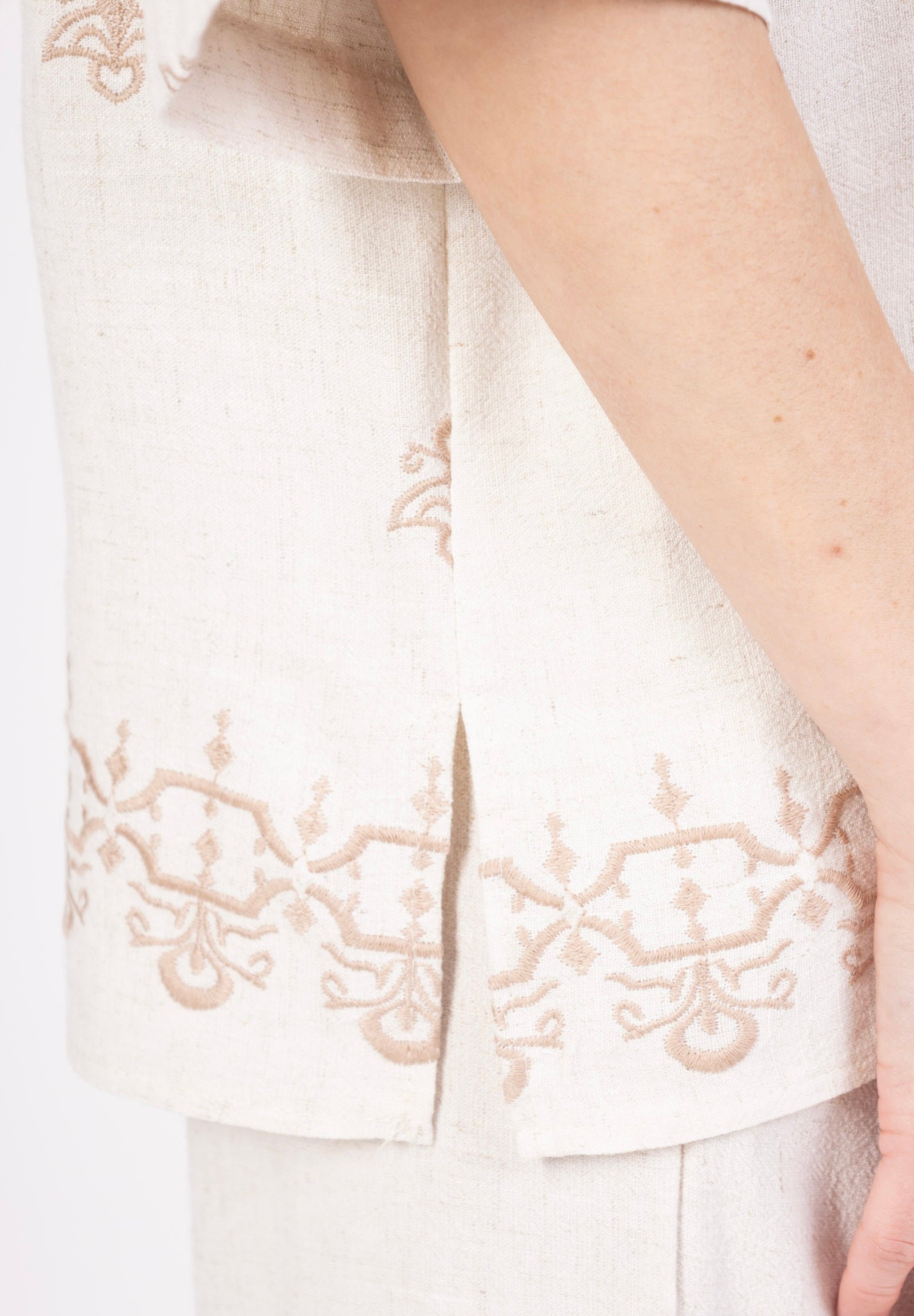 Cette blouse incarne parfaitement l'élégance décontractée des destinations ensoleillées. Conçue dans un mélange noble de lin et de coton, elle offre un visuel haut de gamme grâce à son travail de broderies répétitives et ses finitions soignées. C'est une pièce à forte valeur perçue qui permet une mise en avant attrayante en vitrine, seule ou en ensemble.